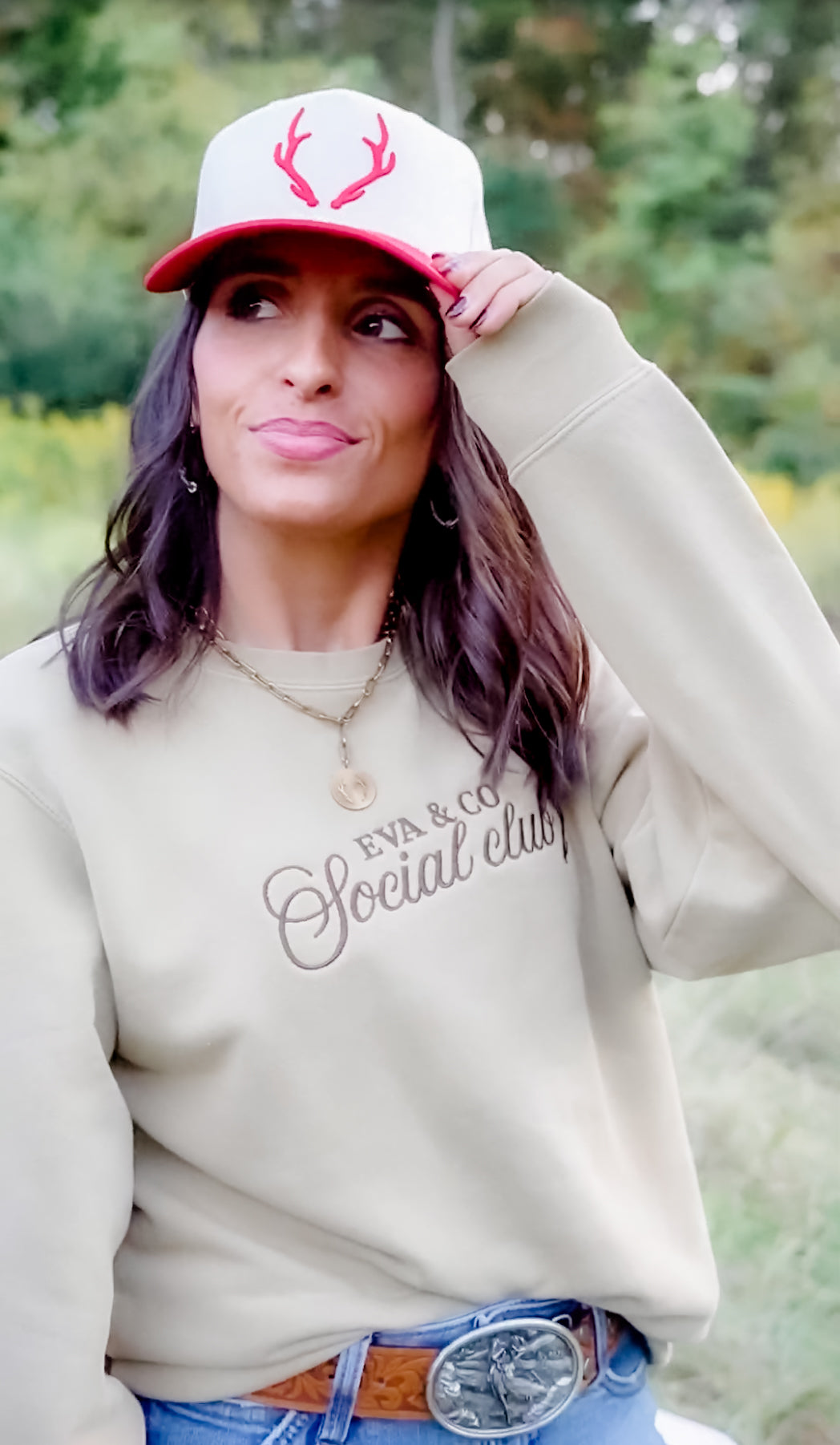 At Eva & Co., we’re all about community, women coming together to share stories, swap skills, lift each other up, and live out their God-given purpose. The Eva Social Club Crew is a cozy nod to that sisterhood, featuring our signature antler and a clean, minimalist design that speaks volumes without saying much at all.